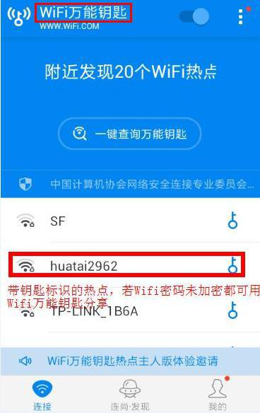 图 1:手机安装WIFI万能钥匙,搜索到带钥匙标的热点,若WIFI密码未加密的情况下可被万 能钥匙分享