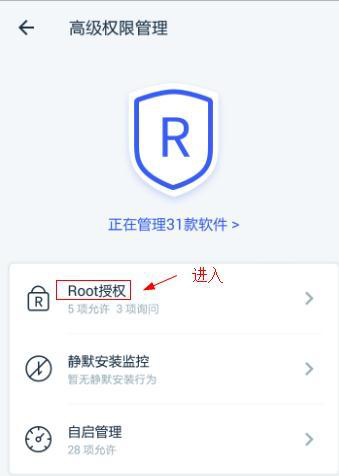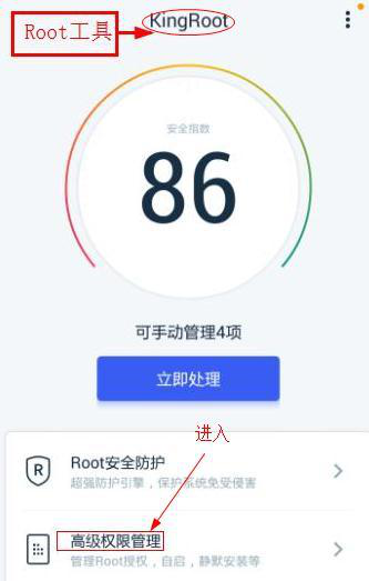 图 3 :使用手机安装的Root工具 ,如King Root(360超级Root亦可)进入高级权限管 理