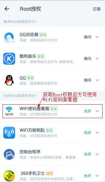 图 5 :获取ROOt权限后方可在手机上安装和使用Wifi密码查看器,设置允许便可