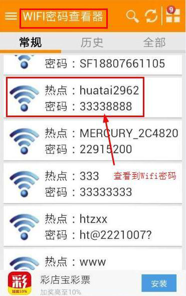 图 6:在手机上的Wifi密码查看器上查看到已连接的Wifi热点的密码